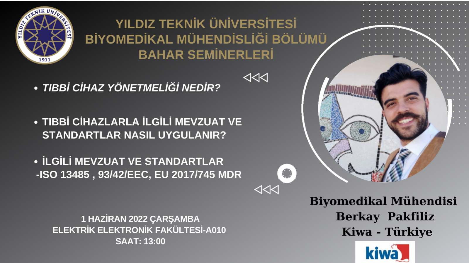 Bölümümüzün düzenlediği ve Bahar döneminin son semineri, Kiwa Türkiye Firmasından Biyomedikal Mühendisi Sayın Berkay PAKFİLİZ tarafından verilecektir.