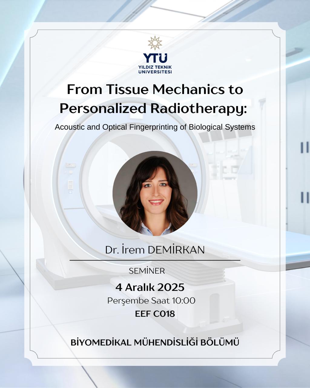 4 Aralık 2025 tarihinde EEF C018'de Dr. İrem Demirkan tarafından verilecek olan "From Tissue Mechanics to Personalized Radiotherap: Acoustic and Optimal Fingerprinting of Biological Systems." seminerine tüm öğrencilerimiz ve akademik personelimiz davetlidir.